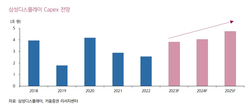 삼성디스플레이의 8.7세대 신규 투자가 본격적으로 시작될 전망이다. 국내 장비 제조사 기준 2Q23~3Q23 사이에 장비 발주가 예상된다. 삼성디스플레이는 이번 라인 증설을 통해 IT OLED 시장 확대에 선제적으로 대응하고 최근 좁혀지고 있는 경쟁사와의 기술 격차를 더 벌릴 것으로 보고 있다.